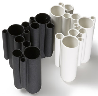 What looks like several delicate, porcelain cylinders, arranged into a smooth, organic shape, is actually soft, unbreakable vinyl, formed with a dipmoulding technique. As a cohesive unit, water is held in the vase and distributed throughout the different parts.