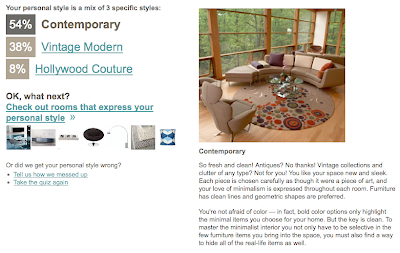 Like I said before, I'm a sucker for "what's your style" type quizzes and I just found this new one via This Young House. In 30 seconds, Sproost promises to pin point your personal home design style. Well, they certainly delivered in my case: 54% Contemporary, 38% Vintage Modern, and 8% Hollywood Couture. Pretty fantastic and a good waste of 30 seconds!