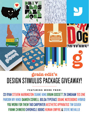 If you're not subscribed to Grain Edit, then you need to be. It is probably one of my favorite blogs in all of Blogland. No one features more cool graphic design and illustration than these guys. They are currently hosting the motherload of giveaways, with over $1000 worth of goods going out to lucky readers. If you want in on the action, you need to subscribe to their feed and/or follow them on Twitter. Easy peasy. Winners will be announced THIS FRIDAY, March 20th. So act now if you want a chance at winning any of the awesome prizes!