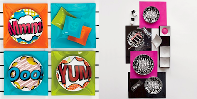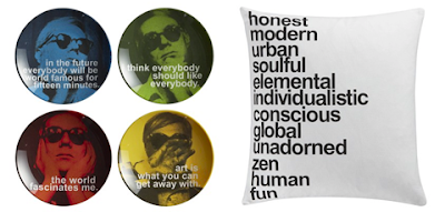 Comic Appetizer Plates $3 | Subliminal Cooler $4.50 | Salt + Pepper Shakers $3 ea. | Cheers Wine Glasses $22 set of 6 | Warhol Quote Plates $1.50 | Credo Pillow $22