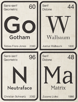 As with traditional periodic tables, this table presents the subject matter grouped categorically. The Table of Typefaces groups by families and classes of typefaces: sans-serif, serif, script, blackletter, glyphic, display, grotesque, realist, didone, garalde, geometric, humanist, slab-serif and mixed.