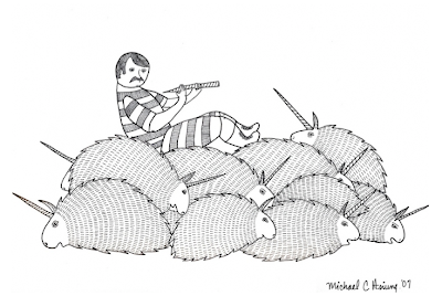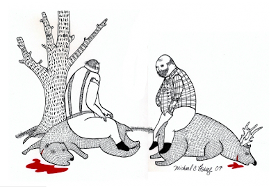 I found Michael's work via the awesome blog "My love for you is a stampede of horses." (which you should all check out if you don't already read it. Seriously.) I'm pretty sure I've fallen in love with one of his drunken mermen, if not one of the other mustachioed lads he's brought to life with that magical pen of his. Check out the rest of his portfolio for more fanciful drawings!