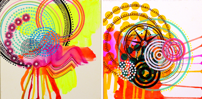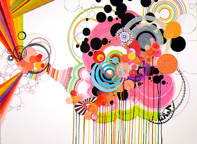 My paintings invite the viewer to experience new and emergent spaces. They explore relational space and the idea that while having no positive existence of its own, space allows everything else to exist. They are full of bright colors, circles and swirls that illustrate a perpetually changing environment. They can be best described as exploding optimism and are unabashedly happy. At this point, I want to experiment with new palettes, add more spontaneous elements, work larger, and learn more about different conceptions of space.