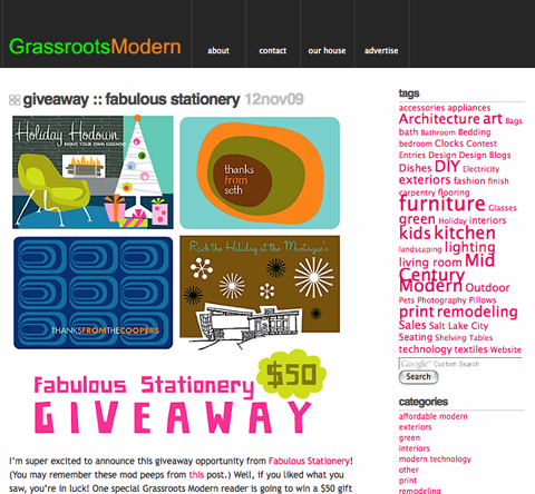 This is a bit of an announcement post, but I promise regular posting for the rest of the day! Pinky swear. I just wanted to tell you about an AWESOME giveaway I'm hosting over on Grassroots Modern. One lucky winner will receive a $50 gift certificate to Fabulous Stationery! This is amazing because Fabulous Stationery is amazing. They have nearly 1500 designs, most of which have a modernist aesthetic. So. Head on over and enter now!!